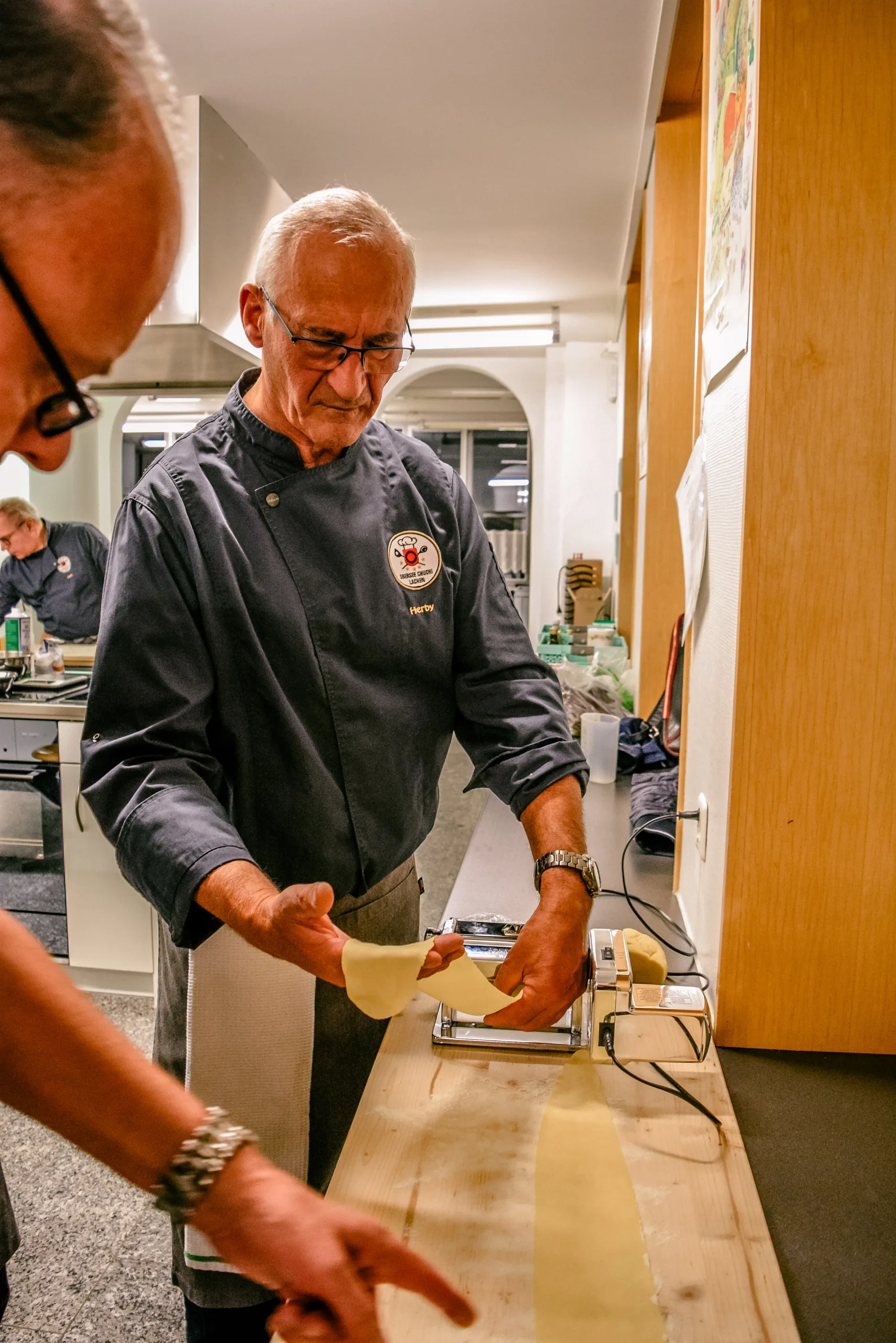 Dann kam der grosse Moment der Ravioli-Herstellung. Unser Pasta-Professor Herby übernahm das Auswallen des Teigs – selbstverständlich mit seiner eigenen Maschine, die er wie einen heiligen Gral mitgebracht hatte. Und es lohnte sich: Herby und seine Maschine sind ein eingespieltes Duo, fast schon ein Liebespaar aus Mehl und Metall.