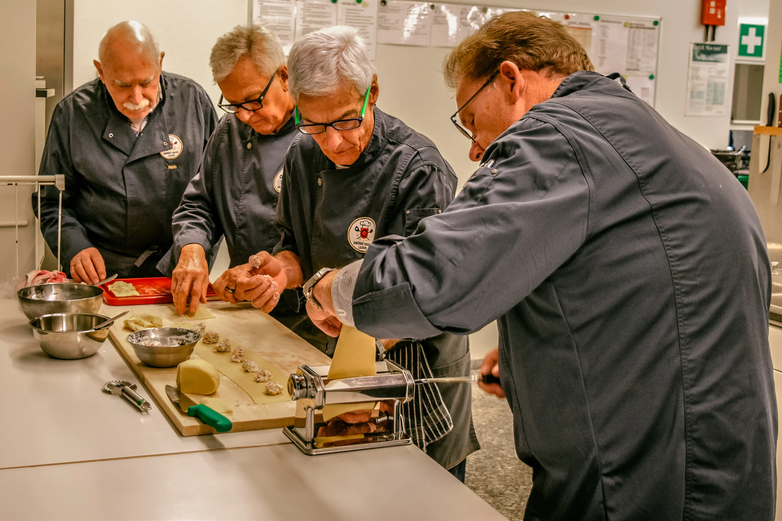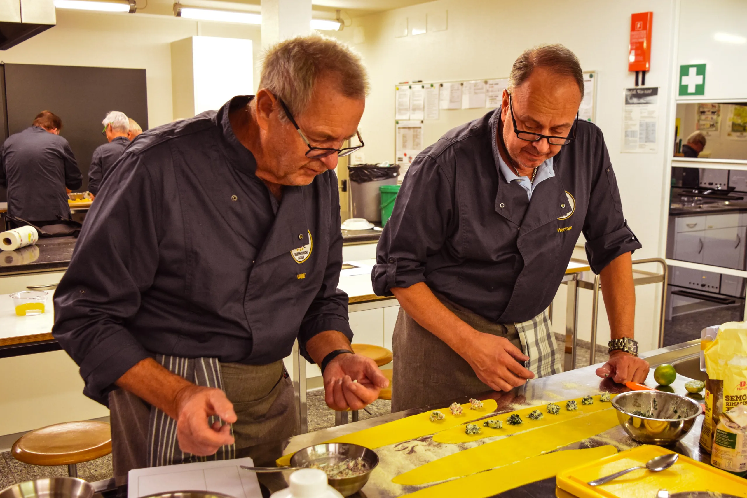So konnten sich die restlichen Chöche ganz auf das Füllen konzentrieren – ein Vorgang, bei dem die Persönlichkeiten deutlicher hervorkamen als bei jeder Vereinsversammlung. Bruno, unser Mann der Berge, formte Ravioli mit einem Gipfel an Füllung; man hätte fast eine Seilbahn darüber spannen können.