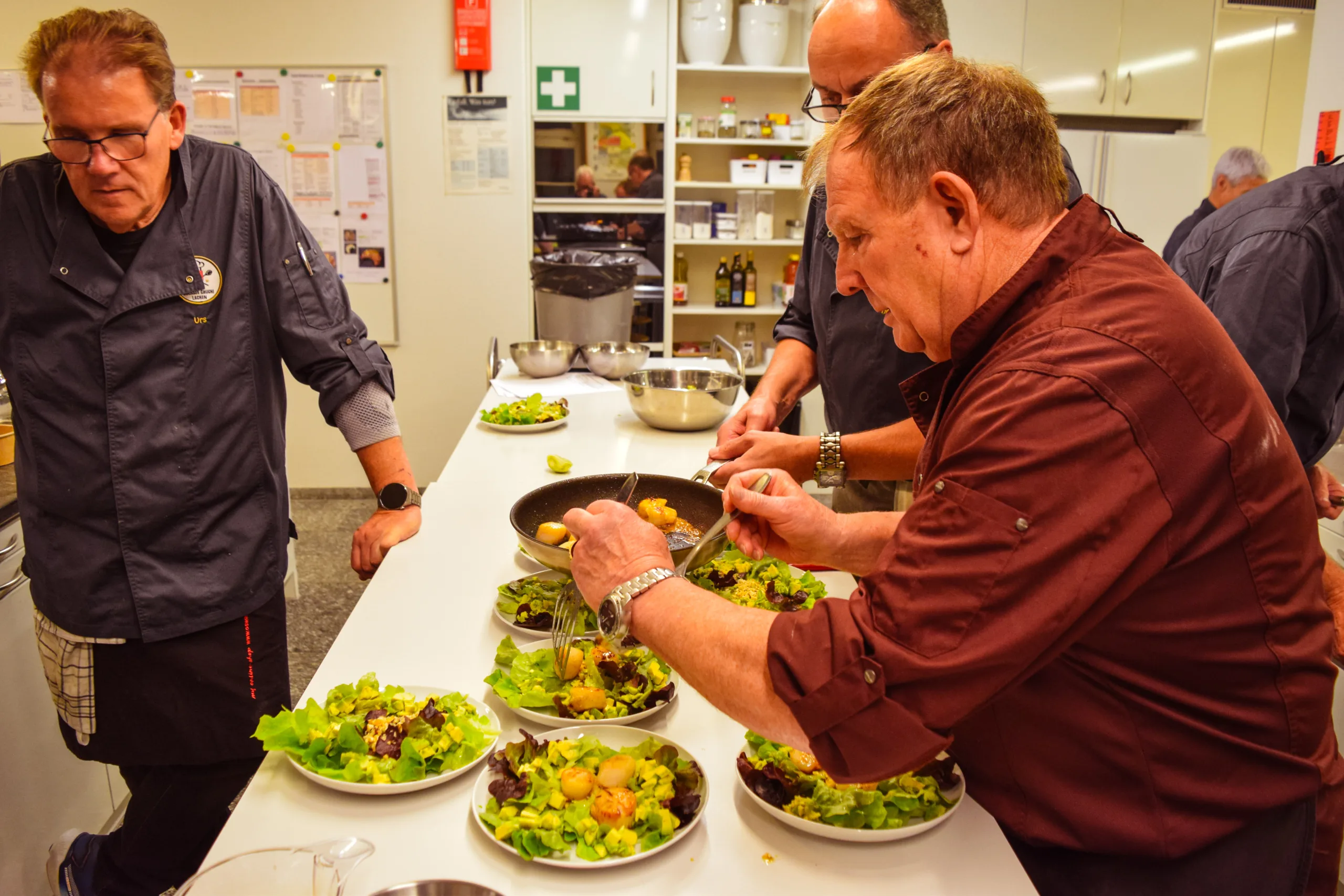 Der Salat selbst war schnell zubereitet – keine grosse Hexerei. Nur bei den Jakobsmuscheln war besondere Aufmerksamkeit gefragt: Sie dürfen in der Pfanne auf keinen Fall zu lange braten. Doch mit wachsamen Augen behielt der Abigchef jede Pfanne im Blick, und so gelang auch dieser Teil des Menüs perfekt. Der Salat war hervorragend – die zarten Jakobsmuscheln in Kombination mit den knackigen Nüssen ergaben ein überraschend harmonisches Spiel aus Texturen und Aromen.