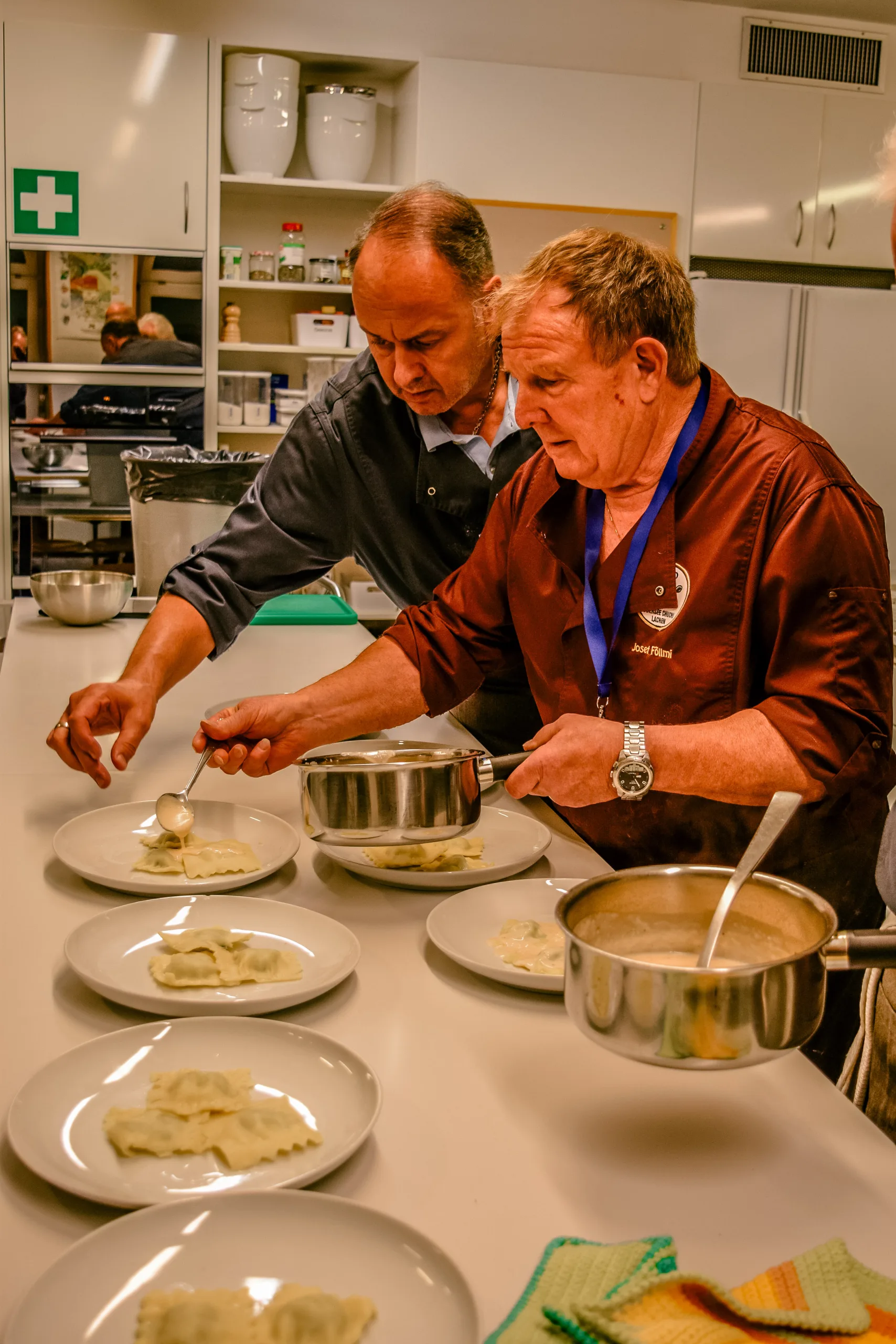 Dann ging es zurück in die Küche, wo die Ravioli fertig gekocht werden sollten – und wo auch die passende Safransauce noch zubereitet wurde. Die drei Ravioli-Sorten wurden einzeln gekocht, sodass wir sie als drei aufeinanderfolgende Gänge servieren konnten. So liess sich jede Füllung für sich geniessen und anschliessend wunderbar vergleichen – ein kleines Ravioli-Tasting, ganz nach unserem Geschmack.