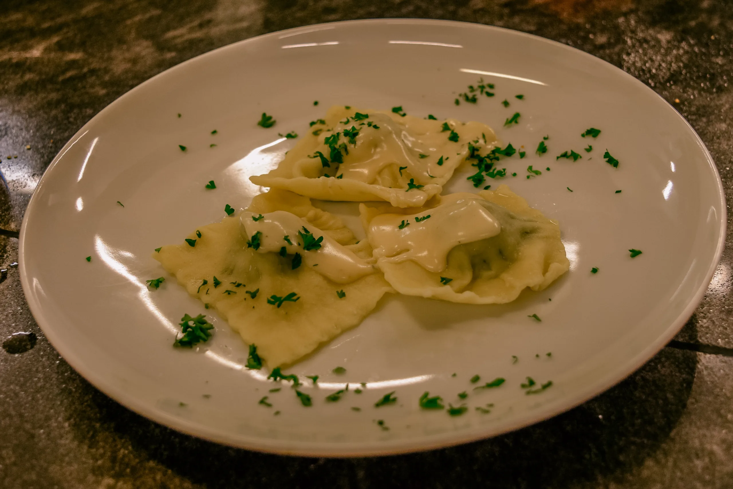 Sepp hatte gleich drei verschiedene Sorten Ravioli als Hauptgang ausgewählt: Ravioli mit Spinat, Ravioli mit geräuchertem Bauernspeck und Ravioli mit Zitronenfüllung (Ravioli al Limone).