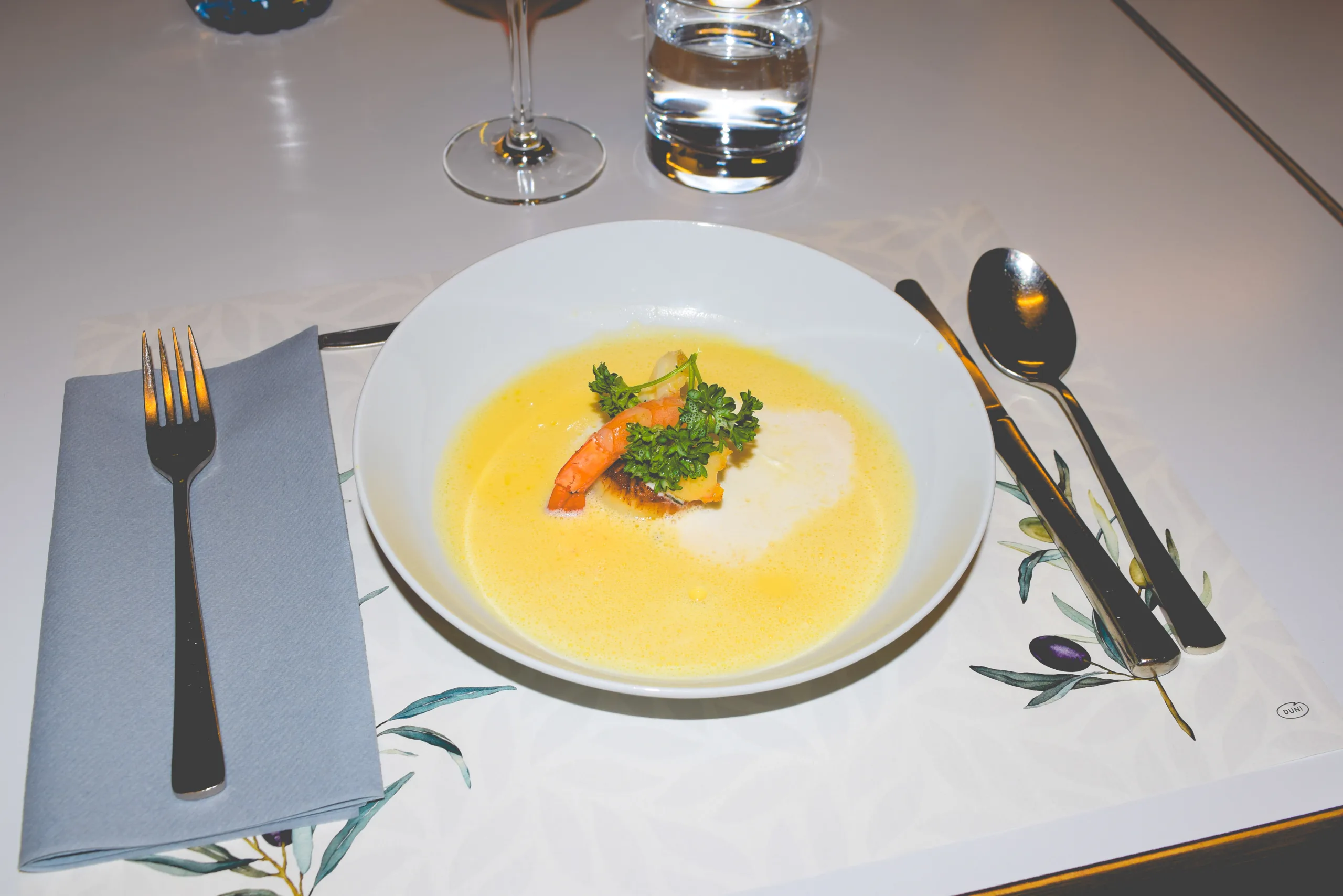 Den Auftakt bildete eine raffinierte Champagnercrème-Suppe, deren samtige Textur und feine Säure des Champagners perfekt mit den zart schmelzenden Jakobsmuscheln und den würzigen Crevetten harmonierten – eine Vorspeise von eleganter Leichtigkeit und grosser geschmacklicher Tiefe.