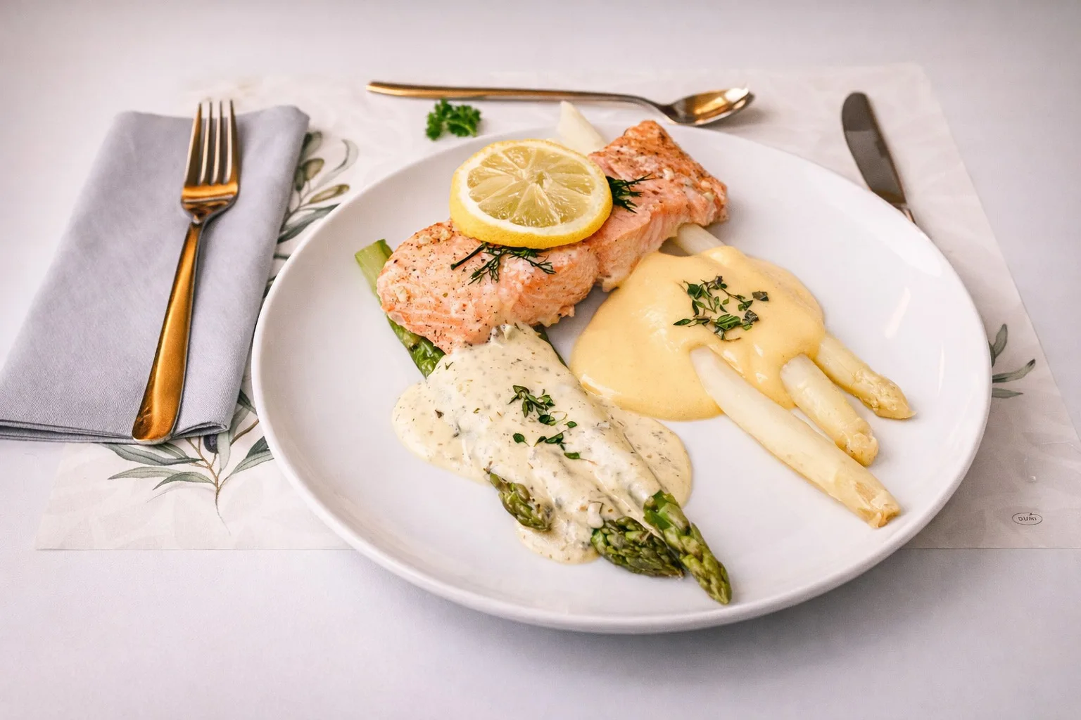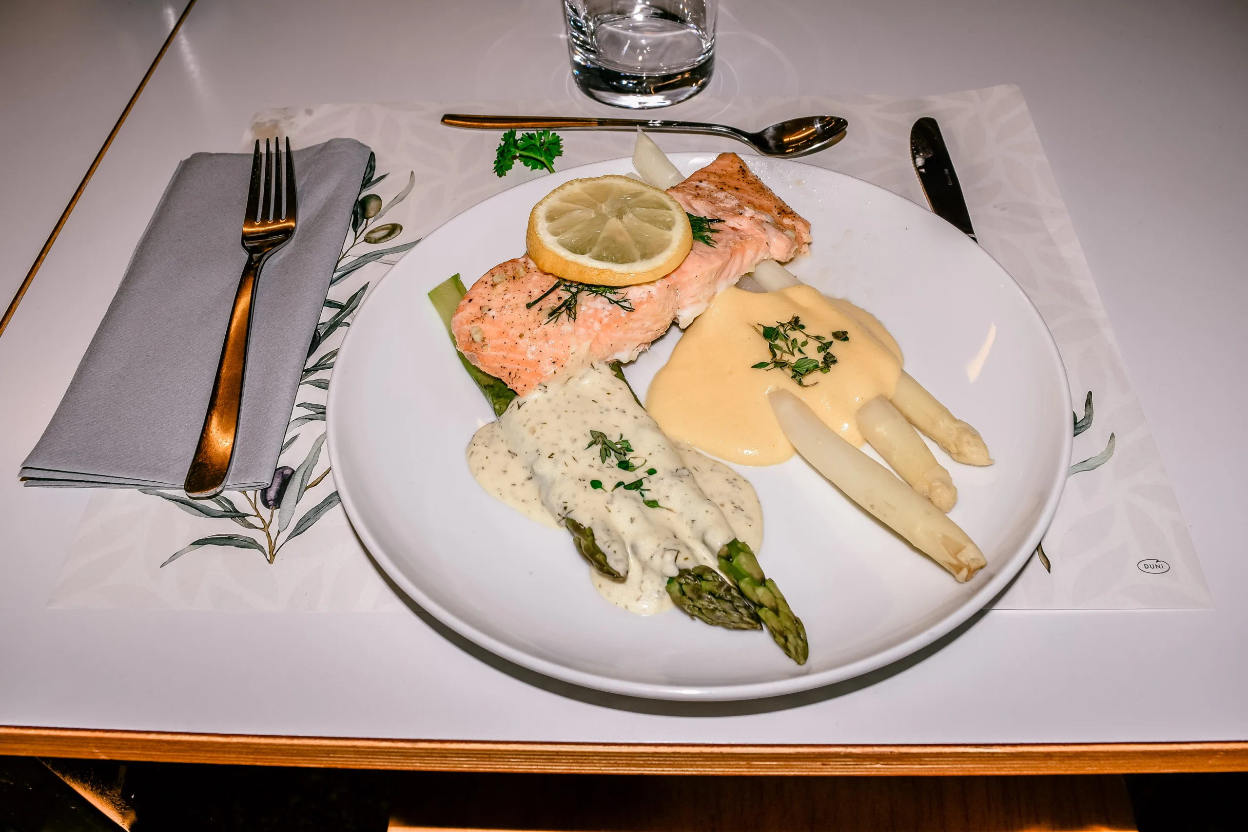 Als Hauptgang präsentierte Reini eine eigene, kreative Komposition: ein raffiniertes «Spargelduetto» mit Lachs und einem passenden «Saucenduetto». Das Spargelduetto vereinte zarten weissen und aromatischen grünen Spargel, die zusammen nicht nur geschmacklich, sondern auch optisch ein harmonisches Zusammenspiel boten. Begleitet wurde das Gericht von zwei sorgfältig abgestimmten Saucen: einer klassischen Sauce Hollandaise sowie einer frischen Zitronen-Dill-Sauce, die dem Ganzen eine angenehme Leichtigkeit verlieh.