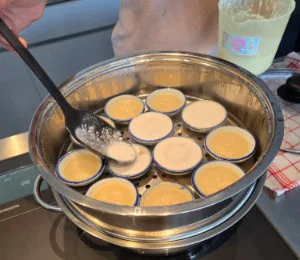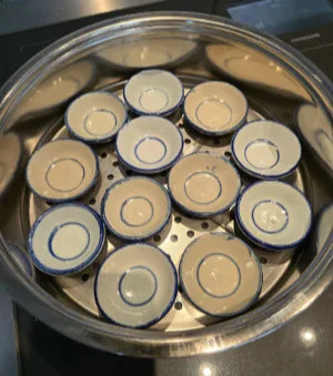 1. Den unteren Teil des Dampfkochtops mit ca. 2 Liter Wasser füllen und auf dem Herd zum Dampfen bringen. Während dem die leeren Schälchen in den mittleren Teil vom Dampfkochtopf legen. Wenn das Wasser dampft, den mittleren Teil vom Dampfkochtop mit den Schälchen auf den unteren Teil des Dampfkochtopfs legen. Es sollte möglichst kein Wasser in den Schälchen sein. Das Wasser vom Deckel wischen und Deckel auf den Dampfkochtop legen und die leeren Schälchen für 5 Minuten dämpfen lassen. Dadurch wird das Dessert am Ende nicht an den Schälchen kleben.