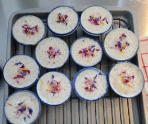 1. Nach 10 Minuten den Deckel sorgfältig wegnehmen, damit kein Wasser in die Schälchen tropft. Den mittleren Teil vom Dampfkochtopf wegnehmen und sicher beiseite stellen. Die heissen Schälchen aus dem Dampfkochtopf nehmen und beiseite stellen. Nach ein paar Minuten mit ein paar geschnittenen Trockenblumen dekorieren.